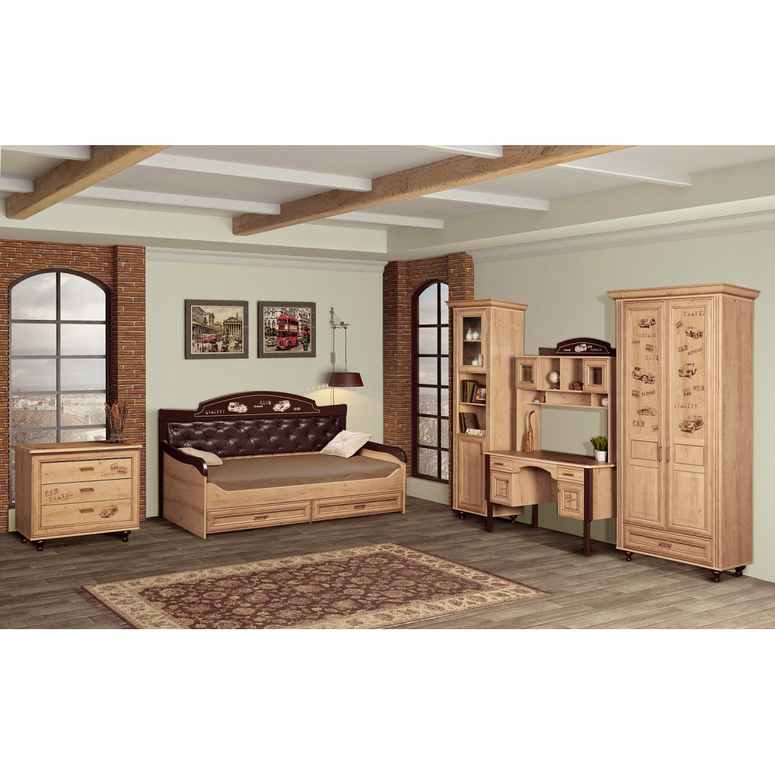 Корпус: ДСП, декор – дуб ридинг. Основание кровати – ламели